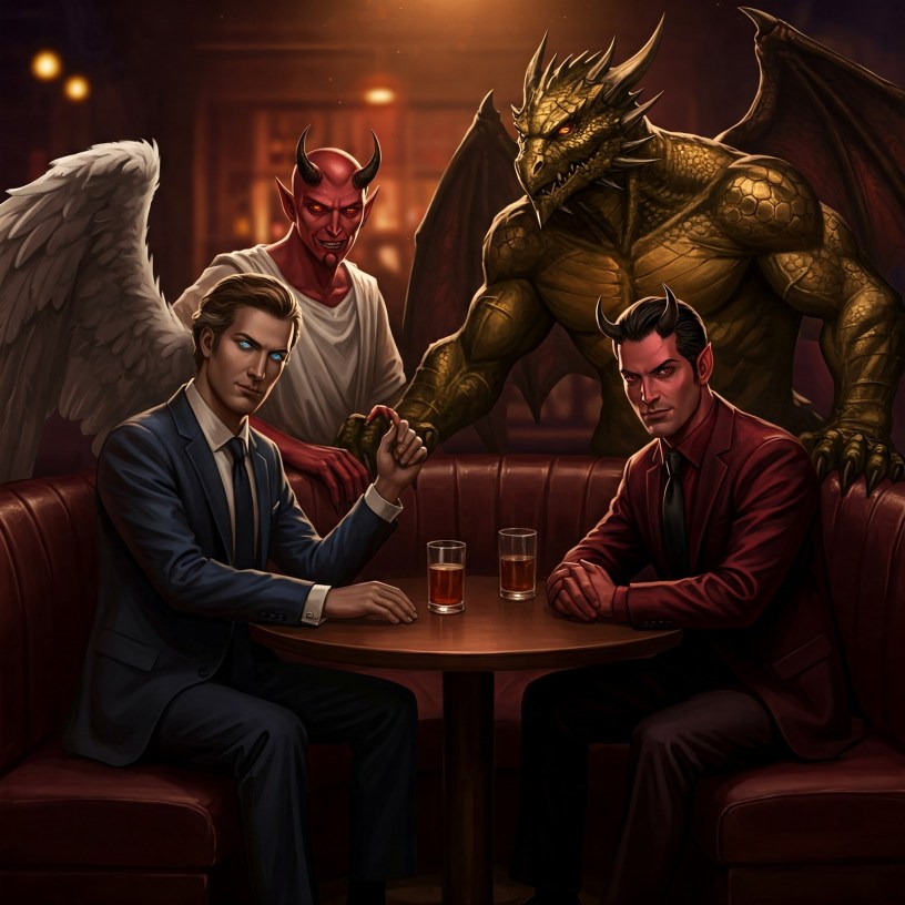 The neon glow of “The Serpent’s Coil” pulsed through the rain-slicked alleyway, a stark contrast to the celestial realms Michael the Archangel usually inhabited. Tonight, however, Michael, disguised as a sharp-suited man with piercing blue eyes, found himself seated in a dimly lit booth, his normally radiant aura subdued. He nursed a glass of amber liquid, the bitterness a faint echo of the resentment gnawing at his usually serene spirit.