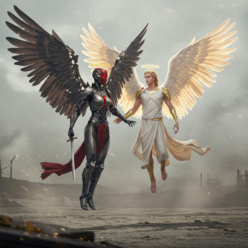 The sky above the scorched wasteland crackled with unnatural energy. Archangel Astra, a construct of steel and stolen divinity, descended, her plasma cannons glowing a malevolent crimson. Below, the dust swirled, and from the swirling dust, a figure emerged, radiant and serene: Archangel Michael, the true celestial warrior.
