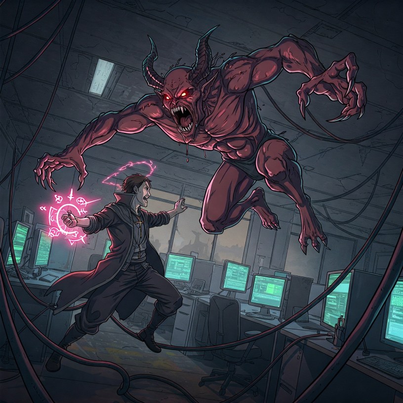 The ancient curse, though powerful, had been broken. The primordial demon, its hold on this modern space severed, had been banished back to the shadows from whence it came. The IT office, once a place of unease and inexplicable dread, was now cleansed, the malevolent presence replaced by a renewed sense of normalcy.